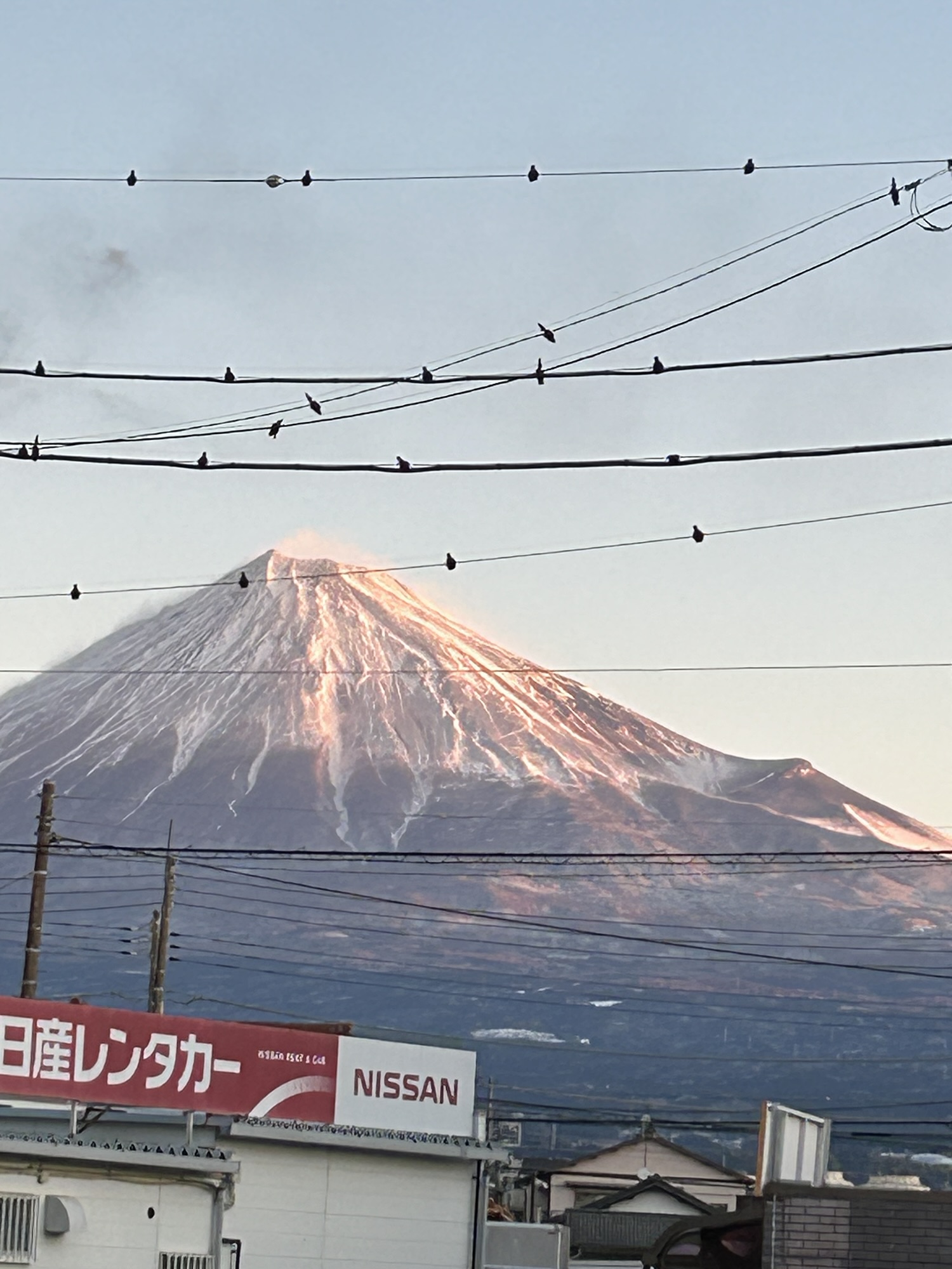 As you can see in the photo, the snow cap is thick and reaches quite far down the slopes. The peak is glowing with a beautiful pinkish-orange hue—what we locals call “Beni-Fuji” (Red Fuji)—as it catches the early morning light.