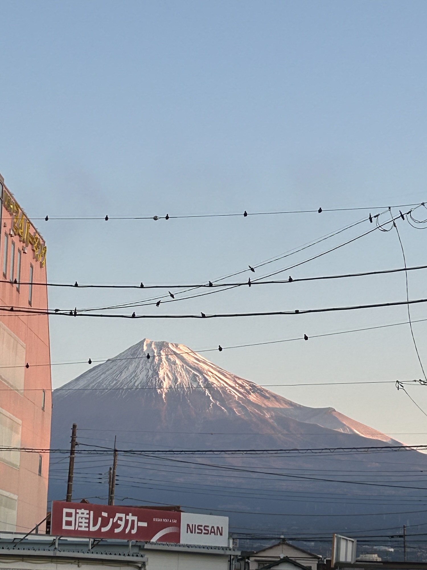 Today offers perfect visibility. As you can see in the photo I took near the station (right by the Nissan Rent-a-car sign), the mountain is visible in its full, massive glory. Even the birds perched on the power lines seem to be enjoying the view! The contrast between the deep blue sky and the white peak is stunningly sharp.